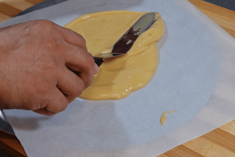 Cuando ya tengas listas las hojas de papel marcadas. Agregamos la mezcla de bizcocho en el centro del circulo y la esparcimos con ayuda de una espátula.