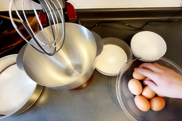 Cuando logremos este punto espumoso denso de nuestros huevos, agregaremos harina cernida, pero esta vez agregaremos los huevos batidos sobre el harina, revolviendo con movimientos envolventes para conservar la mayor cantidad de aire incorporado en nuestros huevos.